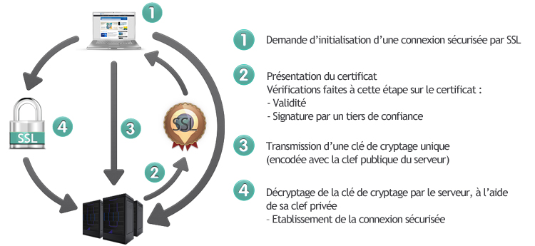 C’est pour cela qu’on utilise des services tiers appelés autorité de certification; Cette dernière délivre le certificat qui permet de confirmer l’identité du serveur et de transmettre une des clés pour décrypter les échanges entre le client et le serveur.