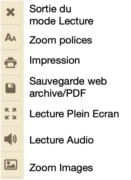 - Une barre d’outils sur le côté permettant : un zoom sur les polices utilisées et/ou les images présentes, la sauvegarde de l’article, son impression et et la sortie du mode sans oublier la possibilité de faire lire l’article par la voix de synthèse.