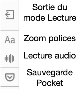 - Une barre d’outils sur le côté permettant : un zoom sur les polices utilisées, la sauvegarde de l’article via le service Pocket et la sortie du mode sans oublier la possibilité de faire lire l’article par la voix de synthèse.