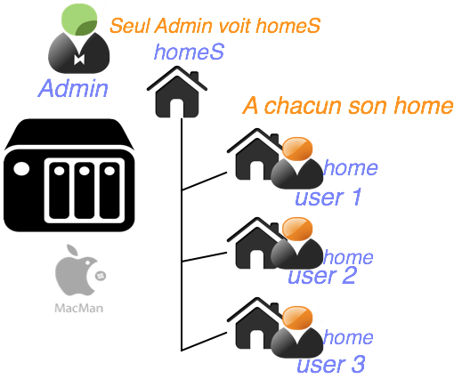 Le dossier homes sur un NAS Synology contient le home de chaque utilisateur du NAS. Sauf à se connecter avec un utilisateur du groupe Administrator (ou d’en avoir expressément ajouter les droits), un utilisateur ne voit QUE son home et jamais le dossier homes contenant les dossiers des autres utilisateurs.